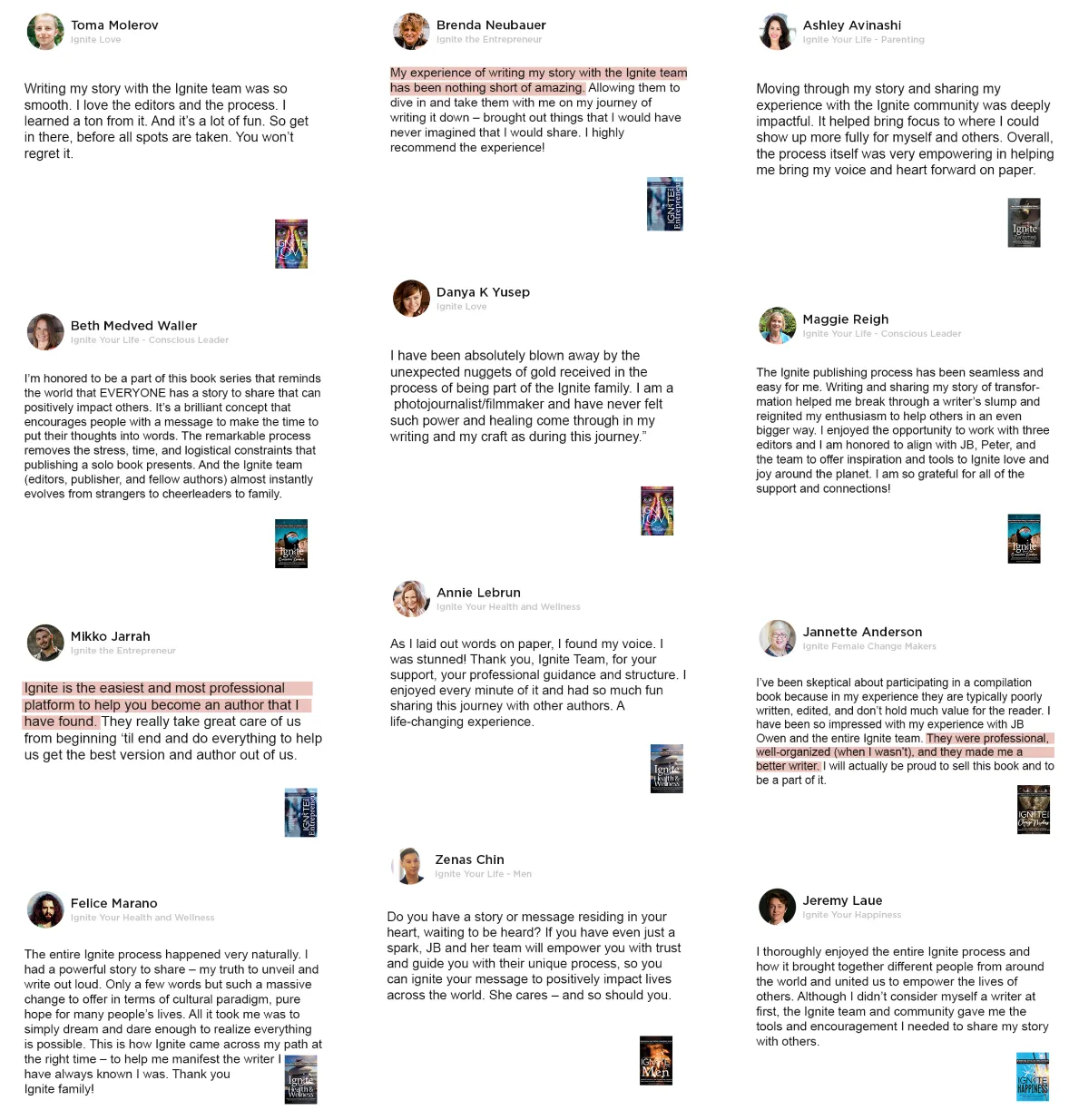 At Ignite, we take you through every step of the road to bestseller: from brainstorming ideas to editing your final draft and marketing you and your published book! We help you turn your personal experiences and knowledge into a powerful, beautifully crafted story through our workshops, editing sessions, and meetings. We work with you as you write your chapter by providing amazon training, editorial support, developing and executing a successful marketing launch plan, and giving you the tools and support you need to go out and discover your own success with your new platform as a bestselling author!